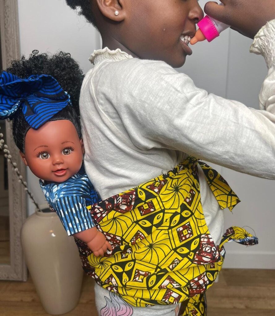 Mon inspiration découle également de l’observation de mes propres enfants. Ils avaient l’habitude de prendre mes foulards, pagnes et même des serviettes à portée de main pour porter leurs poupées Kidunya, en imitant mes gestes : « Maman, je veux bam’bou ma poupée comme toi ! » ou « Maman, peux-tu m’aider à bam’bou ma poupée ? »